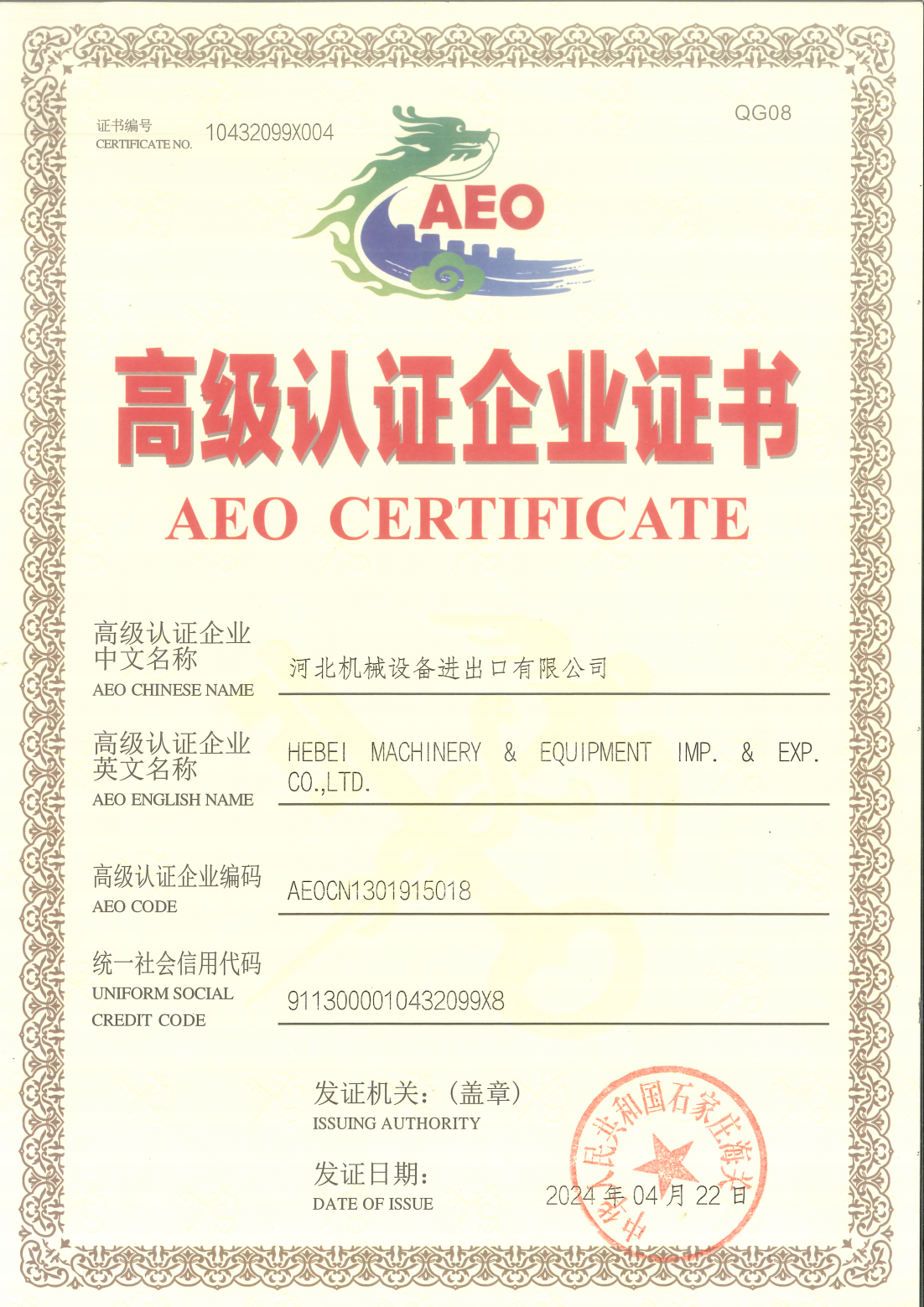 AEO海关高级认证证书