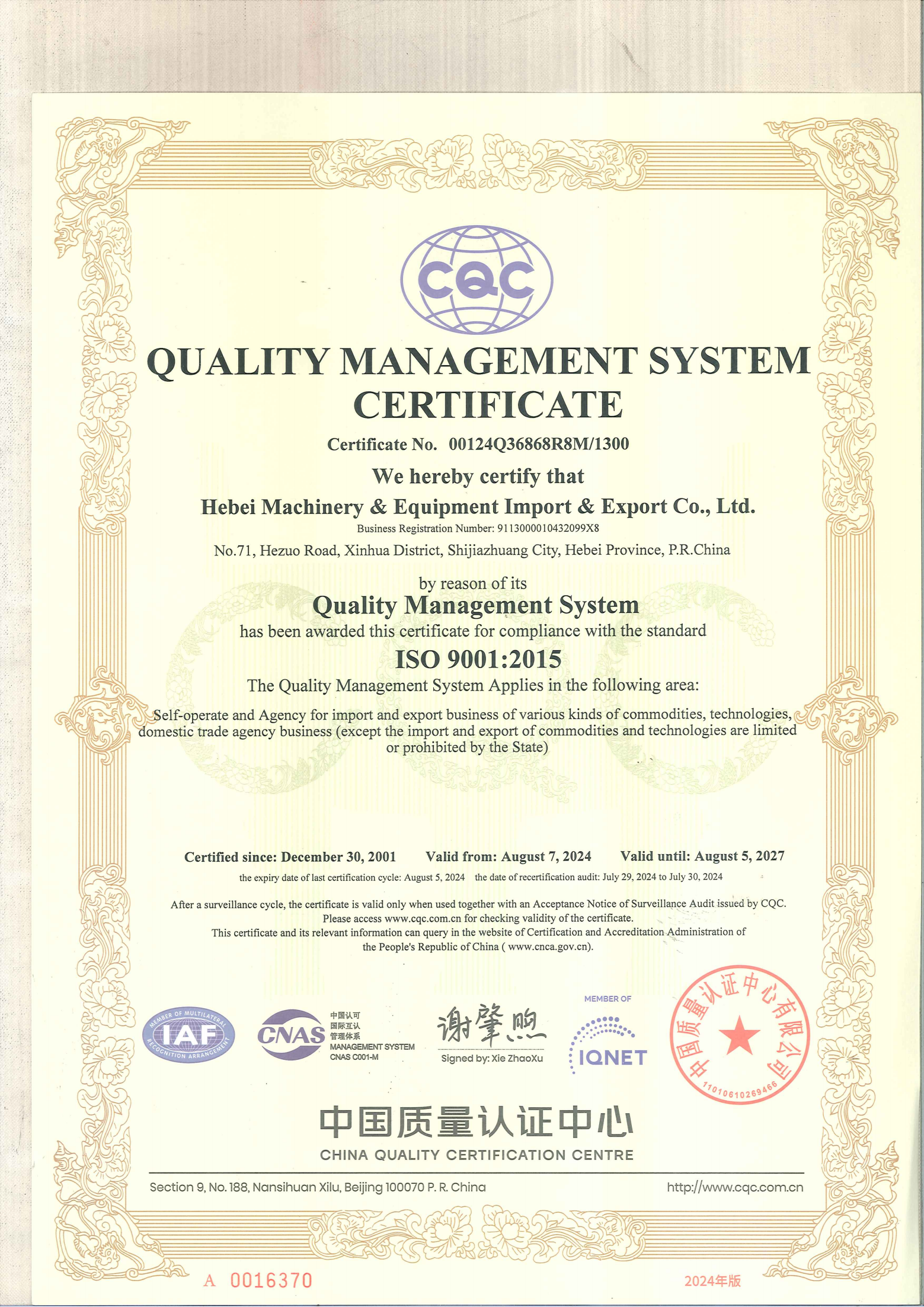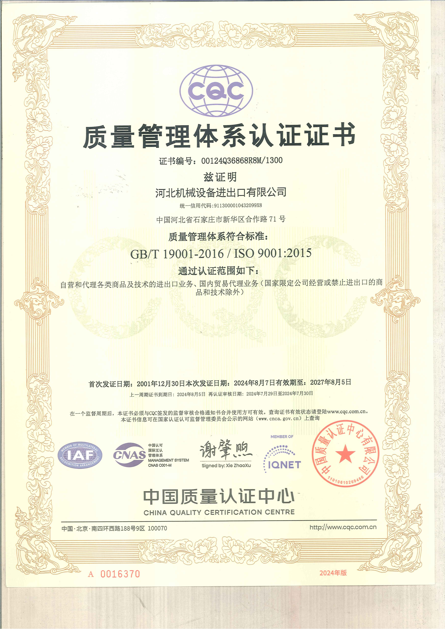 质量管理体系中文证书
