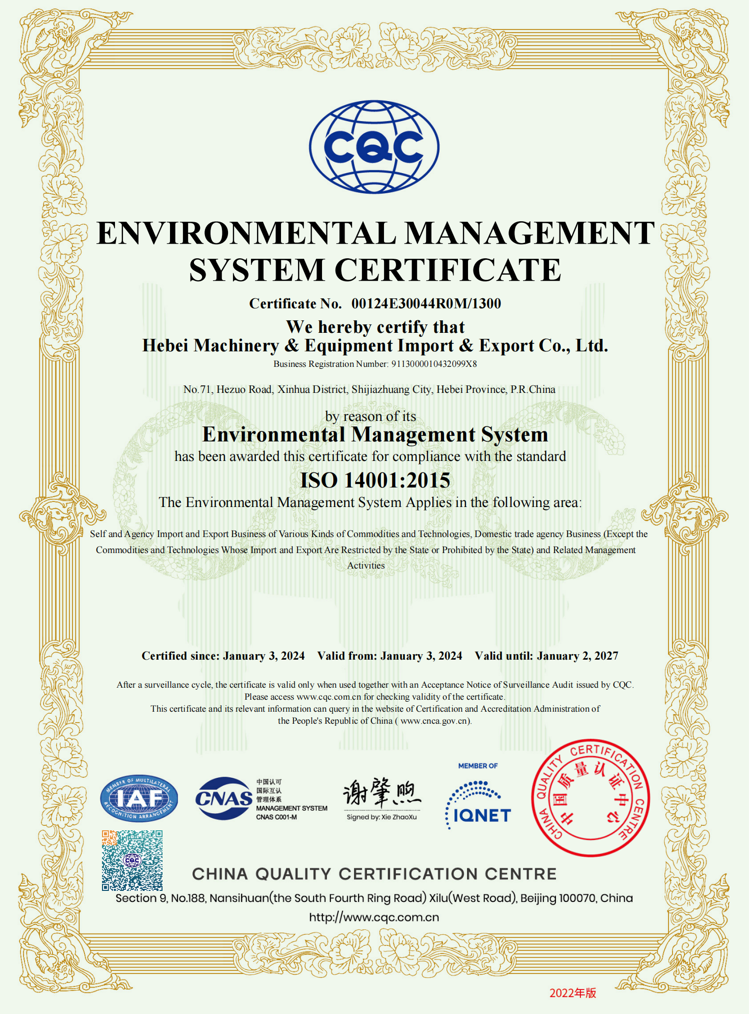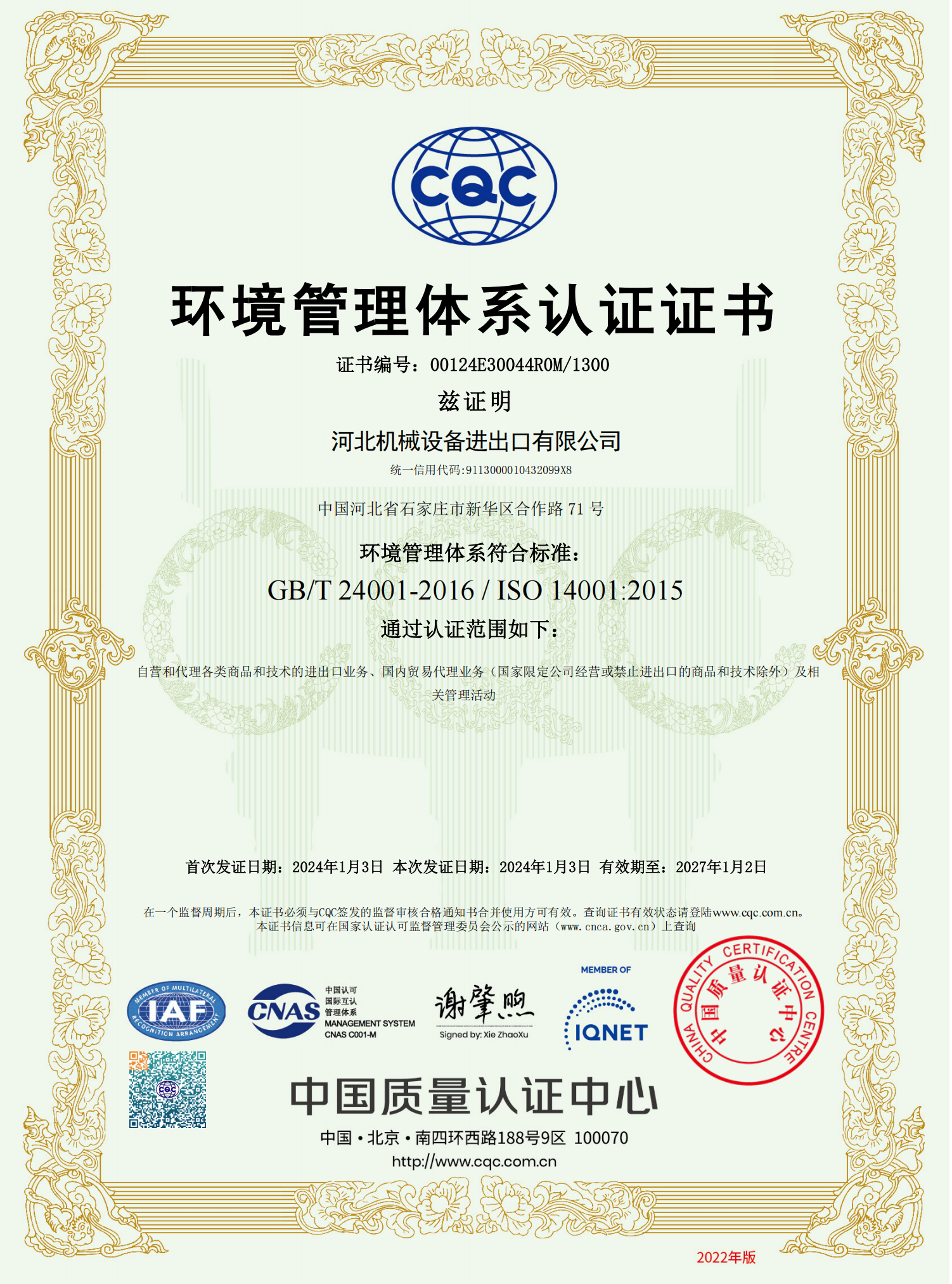 环境管理体系中文证书