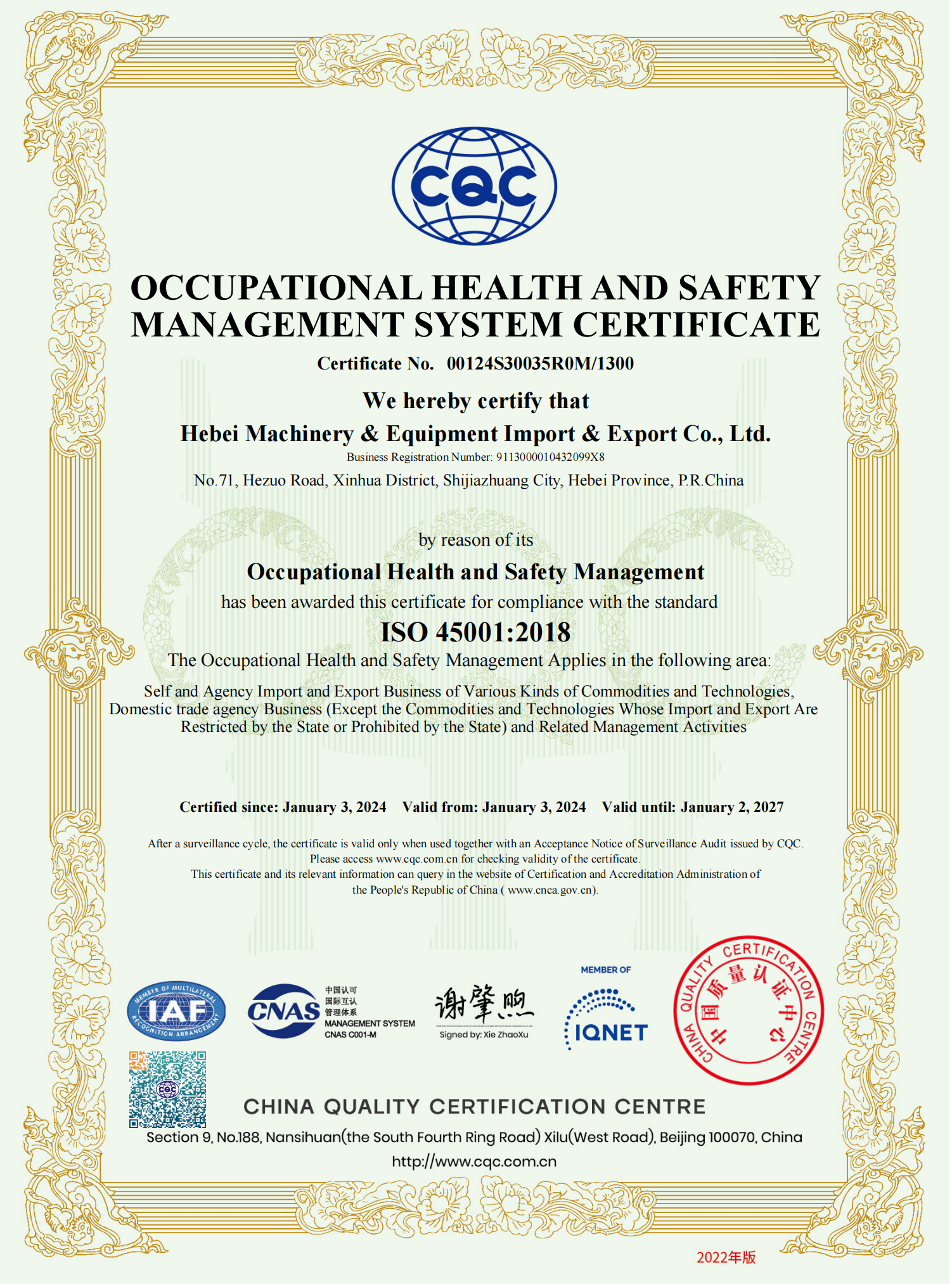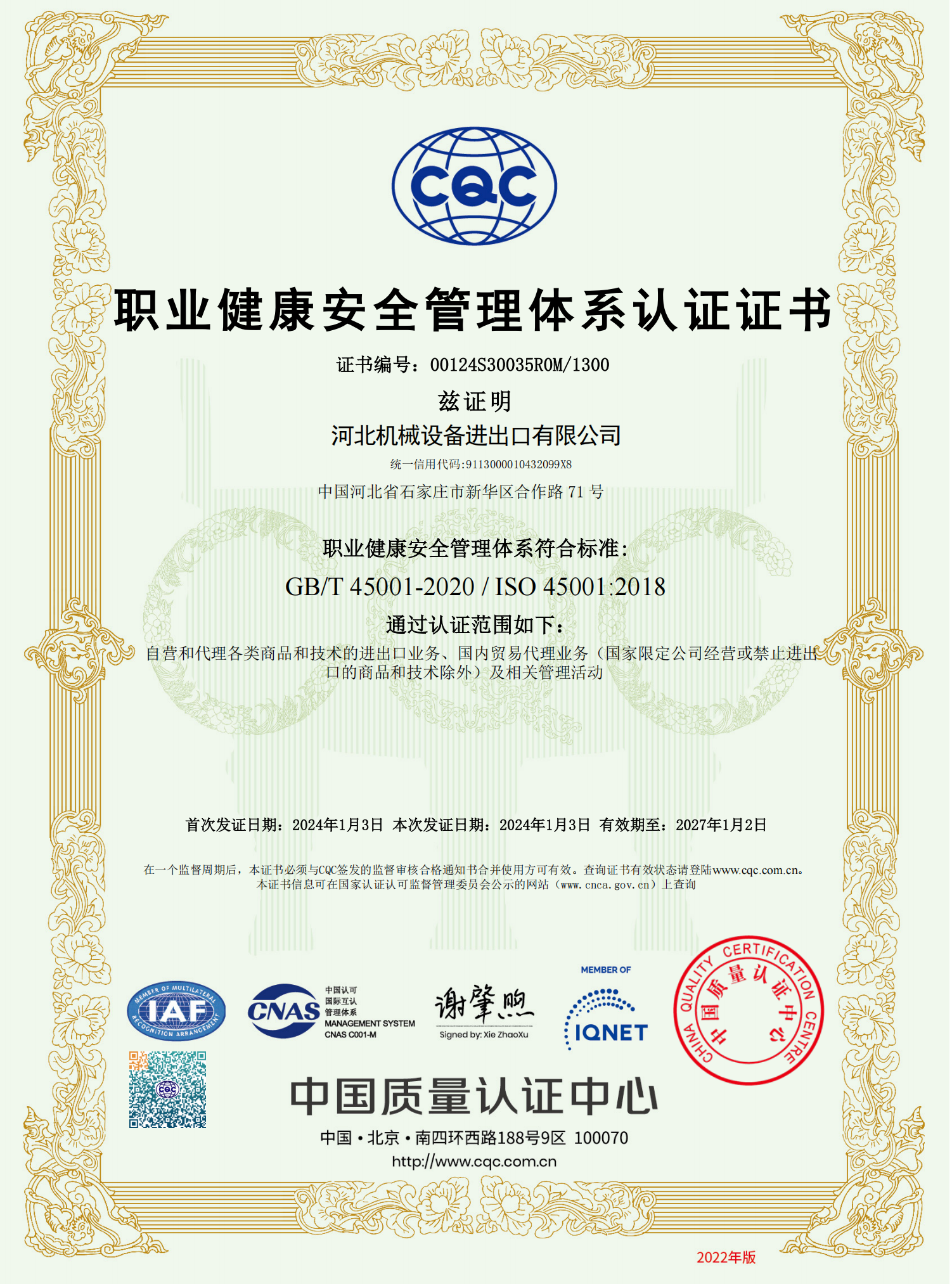 职业健康安全管理体系中文证书